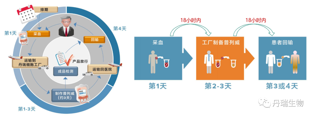 将细胞作为药物具有以下优点: (1)选择性高,细胞药物能感知复杂的人体内环境,只在特定的环境中激活,以发挥相应功能,这意味着可以更大程度上限制药物的副作用; (2)局部浓度高,人体代谢、药物效应动力学和药物代谢动力学决定了分子药物靶向性较低,它不只在病变组织或细胞内分布,而且分布于整个机体组织,这通常会造成严重的脱靶效应,而细胞药物的优势在于可主动迁移到靶组织或靶细胞内发挥作用; (3)更加个性化,由于个体差异,目前很难控制每个患者小分子药物的使用剂量,但在细胞治疗中,可应用合成生物学设计基因开关控制药物的合成或释放,也可以根据临床需要设计不同细胞药物以治疗更多疾病。 中国在细胞治疗领域的基础研究位列世界前列,一些领先企业正在积极进行相关技术的研发,加紧全产业链的布局。如今,我国的细胞治疗产业正处于成功商业化和临床受益的爆发点。 丹瑞核心产品Provenge细胞治疗流程 细胞治疗技术的发展现状 干细胞治疗技术: 随着干细胞监管政策的逐渐明朗和科研投入的不断增加,我国干细胞产业近年来发展迅猛,形成上游干细胞采集和存储、中游干细胞技术及药物研发、下游干细胞移植治疗构成的完整产业链。目前,国内领先企业已经与医院、科研机构等展开大量的合作,共同推进干细胞从基础科研到临床应用的快速转化。据国内专家预测,未来5年,我国干细胞市场规模增速将达到45%左右。 肿瘤免疫细胞治疗技术 我国在CD19、BCMA等靶点的科研临床进展上全球领先。除了炙手可热的CAR-T疗法外,CAR-NK技术的研发正在国内外悄悄兴起。和T细胞相比,NK细胞对肿瘤的杀伤力更强,免疫原性更低。经过Car结构修饰后的NK细胞,也能够高效的识别肿瘤细胞,并通过释放杀伤介质、诱导细胞凋亡等多种手段杀伤肿瘤细胞。 丹瑞Provenge细胞治疗原理 细胞治疗的展望 我国的细胞治疗拥有广阔的应用市场和深厚的科研积淀,同时还拥有中央和地方不断出台的利好政策支持,发展动力强劲。然而,要真正实现细胞治疗产业的快速发展,造福人类健康还需要很长的一段路要走。一方面,国家要继续加大基础研究的投入,创造良好的科研环境,培育和吸引国际一流人才;另一方面,还需要企业加大研发力度,突破细胞治疗的核心技术,打造先进的自动化、工业化的细胞生产工艺体系;同时,相关行业主管部门也要对细胞治疗的政策法规进行进一步的细化和完善,引导行业良性有序发展。 相信随着我国多个细胞治疗项目的转化落地,我国的细胞治疗产业将会迎来一个发展高潮,广大患者也将很快能够享受到细胞治疗新技术成果。 扫描二维码 关注我们 丹瑞生物 细胞治疗的先驱者