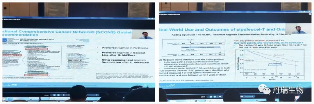 在细胞免疫治疗产业分会场,丹瑞美国医学联络官秦政涛博士通过直播方式分享了丹瑞核心产品普列威的临床研究结果:(1)根据III期临床研究(IMPACT)结果显示: 针对转移去势抵抗性前列腺癌(mCRPC)患者,普列威可以延长患者4.1个月的OS;(2)根据2019年9月发表在《cancer》上的真实世界研究数据(PROCEED)发现,接受普列威治疗的患者(PSA<5.27ng/ml)中位生存时间达到47.7个月;(3)根据2020年2月在《ASCO GU》发表的6000多名Medicare付费医疗保险(Medicare Fee for Service)受益人医疗和药房索赔数据的回顾性分析显示,只要mCRPC患者的治疗方案中包括细胞免疫疗法Provenge与任一种口服新型内分泌疗法Zytiga(醋酸阿比特龙)或Xtandi(恩杂鲁胺),均可以降低死亡风险约45%,并延长总生存期(OS)14.5个月。